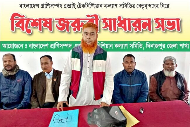 এআই টেকনিশিয়ান কল্যাণ সমিতি দিনাজপুর জেলা শাখার সভাপতি মোঃ সেলিম বাদশার সভাপতিত্বে বিশেষ জরুরী সভায় স্বাগত বক্তব্য রাখেন সমিতির সাধারন সম্পাদক মোঃ রবিউল ইসলাম। ১৩ উপজেলা হতে আগত সকল এআইটি সদস্যরা তাদের অভিমত ব্যক্ত করে বক্তব্য রাখেন। তারা হলেন-চিরিরবন্দর উপজেলা শাখার সাধারন সম্পাদক মোঃ মোজাহার আলী, দিনাজপুর সদর উপজেলা সাংগঠনিক সম্পাদক মোঃ ইমরান আলী, কাহারোল উপজেলা সহকারী সাধারন সম্পাদক কার্তিক চন্দ্র রায়, খানসামা উপজেলার সভাপতি আমিনুর রহমানসহ সকল উপজেলার নেতৃবৃন্দ। সভায় এআই টেকনিশিয়ান কল্যাণ সমিতি দিনাজপুর জেলা শাখার সভাপতি মোঃ সেলিম বাদশা বলেন, বিগত আন্দোলনের ফসল হিসেবে আমরা পেতে যাচ্ছি। তারই প্রেক্ষিতে প্রতিটি উপজেলা হতে ১ জন করে আমাদের মধ্য থেকে আউটসোর্সিং এর মাধ্যমে এআই টেকনিশিয়ান নিয়োগ প্রক্রিয়া চলমানের পথে রয়েছে। আগামীতে পর্যায়ক্রমে সকল ইউনিয়ন হতে ১ জন এআই টেকনিশিয়ানকে আউটসোর্সিং এ নেওয়ার জন্য কার্যক্রম অব্যাহত রয়েছে। এআই টেকনিশিয়ানদের বিভিন্ন সমস্যা সমাধানে এবং তাদের দাবী পরবর্তীকালে আদায়ের লক্ষে সংগঠনকে আরও গতিশীল ও বেগবান করতে সকল সদস্যদের সংগঠনের পতাকাতলে ঐক্যবদ্ধভাবে আসার আহবান জানিয়ে সভার সমাপ্তি ঘোষনা করেন।