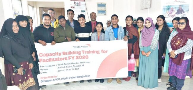 কাশী কুমার দাস, বিশেষ প্রতিনিধিঃ ২১ জানুয়ারী বুধবার দিনাজপুর এরিয়া প্রোগ্রাম, ওয়ার্ল্ড ভিশন বাংলাদেশের আয়োজনে ইয়ুথ ফোরাম মেম্বার ফেসিলিটেটরদের সক্ষমতা বৃদ্ধির লক্ষ্যে ১৯ জানুয়ারী হতে ২১ জানুয়ারী ৩দিনব্যাপী প্রশিক্ষণ কোর্সের সমাপ্তি হয়েছে। উক্ত প্রশিক্ষণে ১৮ জন প্রশিক্ষনার্থী অংশগ্রহণ করেন।