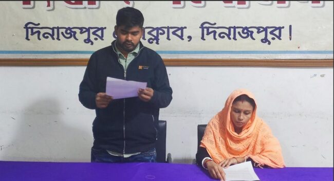 গতকাল বুধবার দুপুরে দিনাজপুর প্রেসক্লাবে এক সংবাদ সম্মেলনে এই অভিযোগ করেন দিনাজপুর জেলা শহরের নিমতলা এলাকার সহদেব কুমার রায়ের ছেলে জয়কুমার রায়। এ সময় তার স্ত্রী উর্মিলা রানী উপস্থিত ছিলেন।