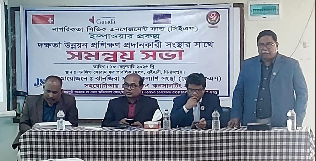 কাশী কুমার দাস, বিশেষ প্রতিনিধিঃ ১৮ ফেব্রুয়ারী বুধবার সুইহারীস্থ এনজিও ফর পাবলিক হেলথ এর হলরুমে ঝানজিরা সমাজ কল্যাণ সংস্থা (জে এস কে এস) এর আয়োজনে জিএফএ কনসালন্টিং গ্রুপ এর সহযোগিহতায় নাগরিকতা-সিভিল এনগেজমেন্ট ফান্ড (সিইএস) ইম্পাওয়ার প্রকল্পের আওতায় দক্ষতা উন্নয়ন প্রশিক্ষণ প্রদানকারী সংস্থার সাথে সমন্বয় সভা অনুষ্ঠিত হয়েছে।