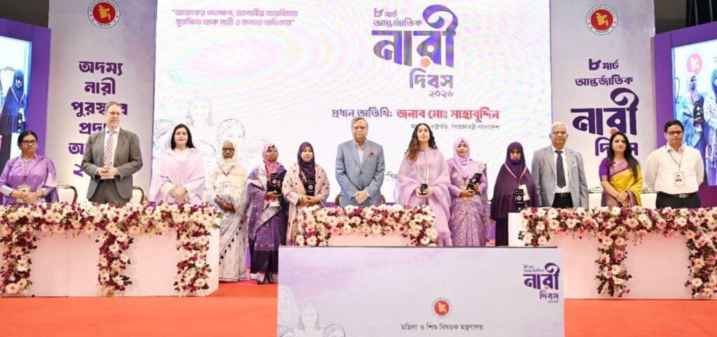 রাজধানীর ওসমানী স্মৃতি মিলনায়তনে ‘আন্তর্জাতিক নারী দিবস-২০২৬’-এর অনুষ্ঠানে প্রধান অতিথি হিসেবে ভাষণ দেন রাষ্ট্রপতি মো. সাহাবুদ্দিন। অনুষ্ঠানে সভাপতিত্ব করেন মহিলা ও শিশু বিষয়ক মন্ত্রী ডা. এ জেড এম জাহিদ হোসেন।