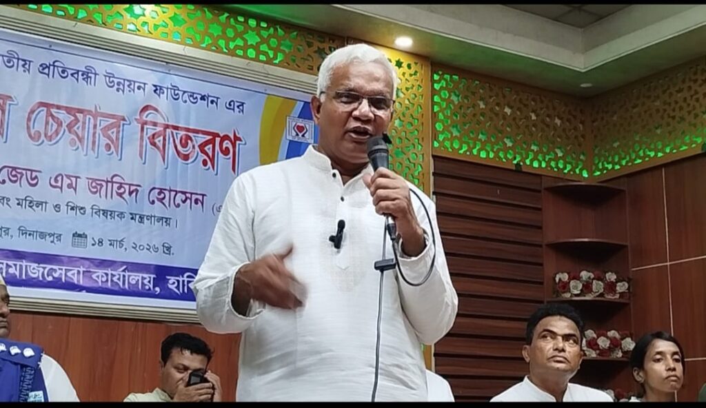বিএনপি সরকার ক্ষমতায় এসেই নির্বাচনী প্রতিশ্রুতি বাস্তাবায়ন শুরু করেছে বলে উল্লেখ করে সমাজকল্যাণ এবং মহিলা ও শিশু বিষয়ক মন্ত্রী ডা. এ জেড এম জাহিদ হোসেন বলেছেন, মাত্র ২৬ দিন হল বিএনপি সরকার ক্ষমতায় এসেছে। ইতোমধ্যে কৃষকদের ১০ হাজার টাকা পর্যন্ত কৃষি লোন সুদসহ মৌকুফ করা হয়েছে। ফ্যামিলি কার্ডের পাইলট প্রকল্পের উদ্ভোধন করা হয়েছে। এখন সরকারের একমাত্র লক্ষ্য ৩১ দফা দ্রুত বাস্তবায়ন করা। শনিবার বিকেলে হাকিমপুর উপজেলা প্রশাসন কর্তৃক আয়োজিত অসহায় ও প্রতিন্ধিদের মাঝে অনুদান ও হুইলচেয়ার বিতরণ অনুষ্ঠানে প্রধান অতিথির বক্তব্যে তিনি এ কথা বলেন।